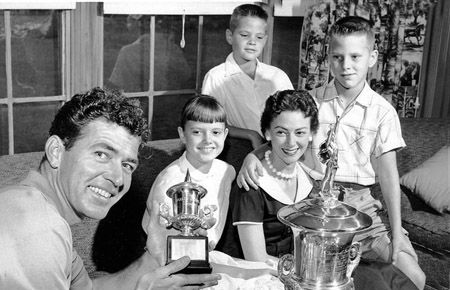 Carroll's family-daughter Sharon, wife Jeanne, and sons Patrick (L) and Michael (R), appreciated all the races and trophies he won in 1952 and 1953. During those early years Shelby established himself as an up and coming driver with twelve victories. It was just the beginning of what was to become a brilliant international racing career.