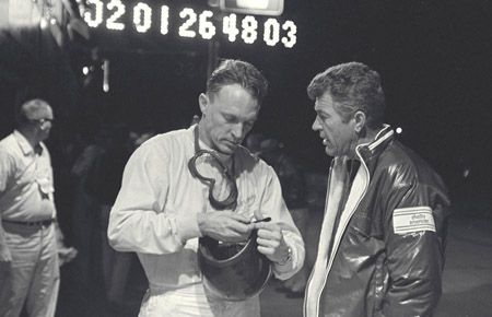Carroll Shelby selected only the finest, world class drivers for the Cobra and Ford endurance racing programs. Pictured here with Dan Gurney during the 1966 12 Hours of Sebring, as they discuss the performance of Gurney's Ford GT.