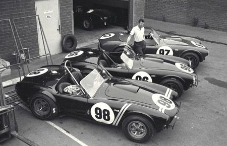 Carroll Shelby stands proudly with three of his competition Cobras. The 289 Cobra roadsters beat their main competition, the Chevrolet Corvette, across America, building a strong performance image for the Cobra brand and Shelby American.